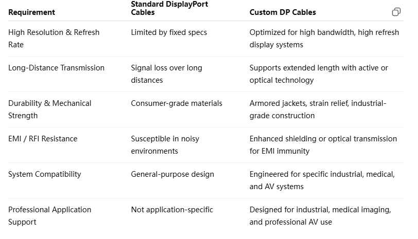 Custom DP cables are engineered to address these challenges through reinforced materials, improved shielding, and optional active or optical signal conversion.